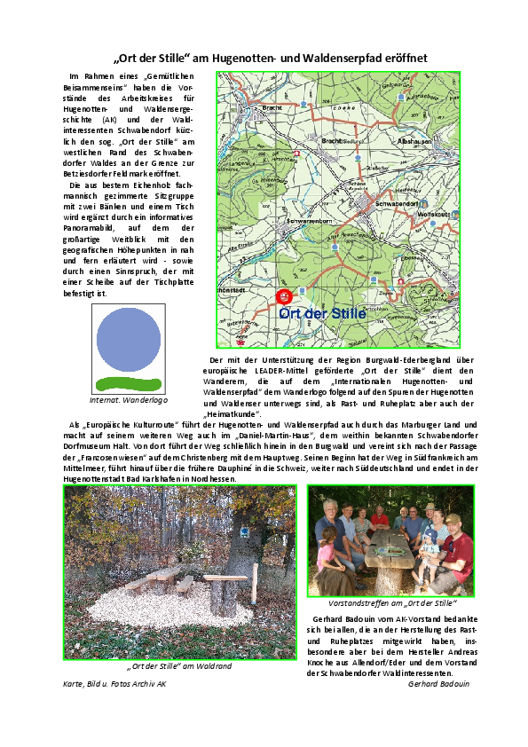 Ein neuer Ort der Stille ist am Hugenotten- und Waldenserpfad entstanden. Lesen Sie die Details im pdf.