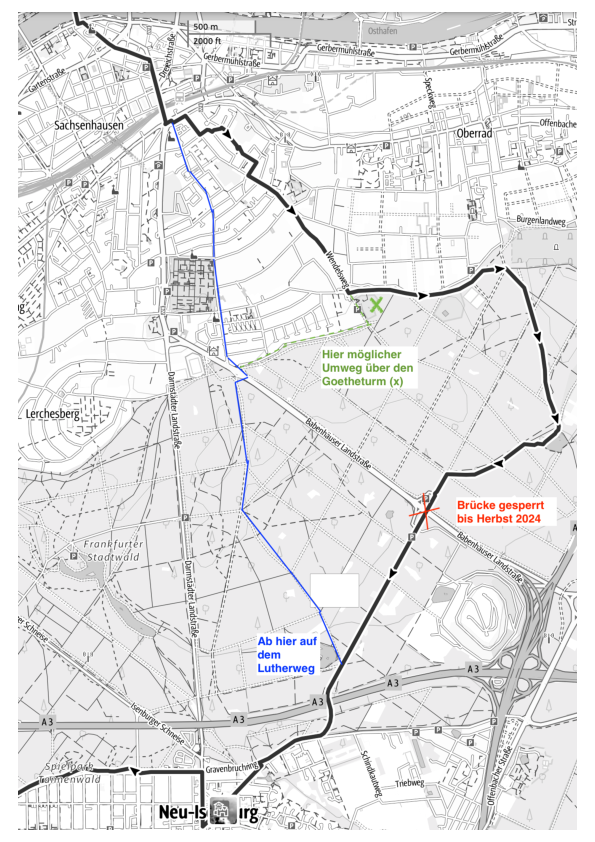 Im Frankfurter Stadtwald ist noch bis Herbst 2024 eine Fußgängerbrücke über die Babenhäuser Landstraße gesperrt. Wir empfehlen Wanderern, die von Süden kommen, nach der Überquerung der A 3 nördlich Neu-Isenburg auf dem Lutherweg weiterzugehen und dort bis Sachsenhausen zu verbleiben, bis der Lutherweg wieder auf den Hugenotten- und Waldenserpfad stößt.
